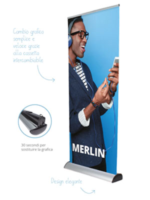 Un esclusivo e rivoluzionario roll up che unisce la ricercatezza e l’eleganza di un oggetto di design ad un sistema di cambio rapido della grafica e ad una pratica cassetta che lo rende più economico di qualsiasi roll up presentato sul mercato. Inoltre gli inserti laterali sostituibili rendono personalizzabile questo straordinario prodotto.