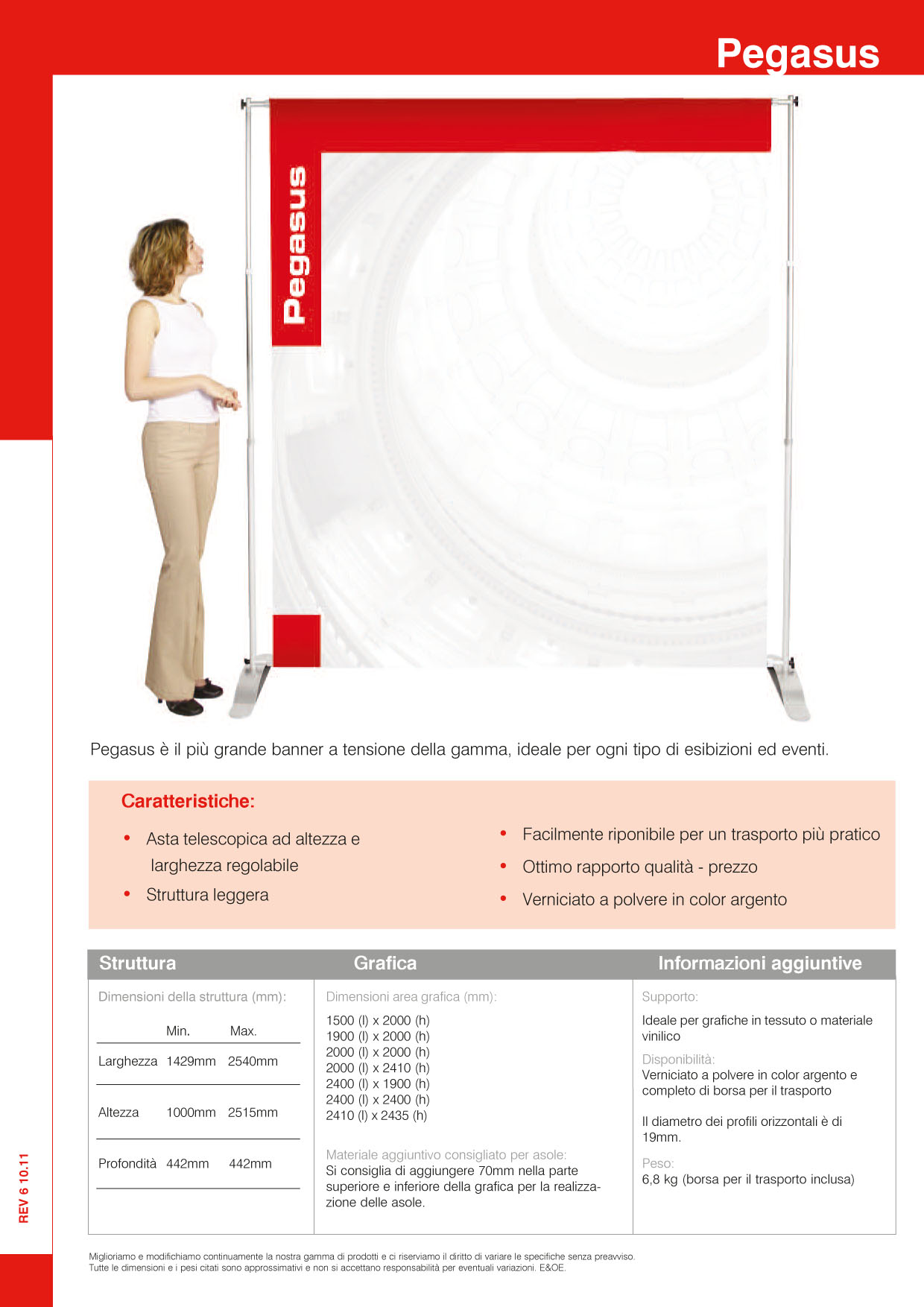 Pegasus è il più grande banner a tensione della gamma, ideale come fondale in eventi dimostrativi. E' regolabile in altezza e larghezza ed è molto leggero.